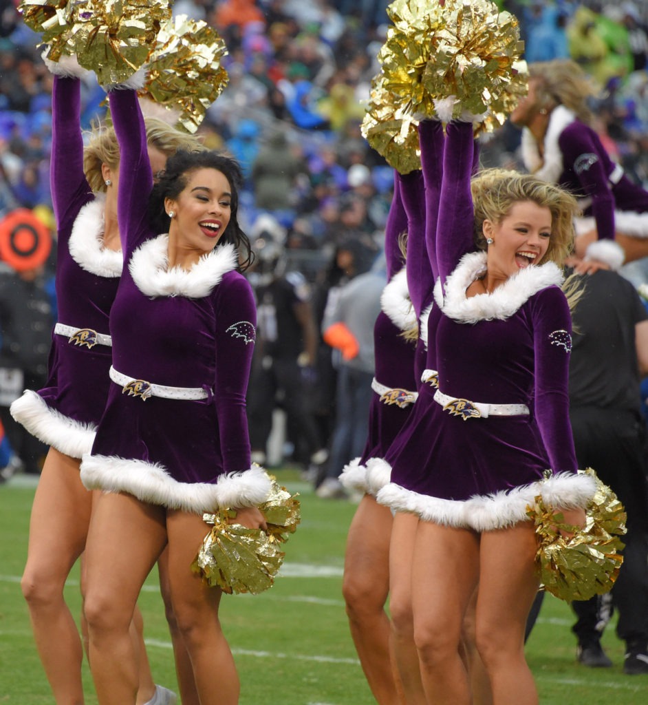 Along with the Seattle Seahawks Dancers the Ravens squad is a co-ed squad, with the female cheerleaders doing various dance moves, and the males working on stunts.